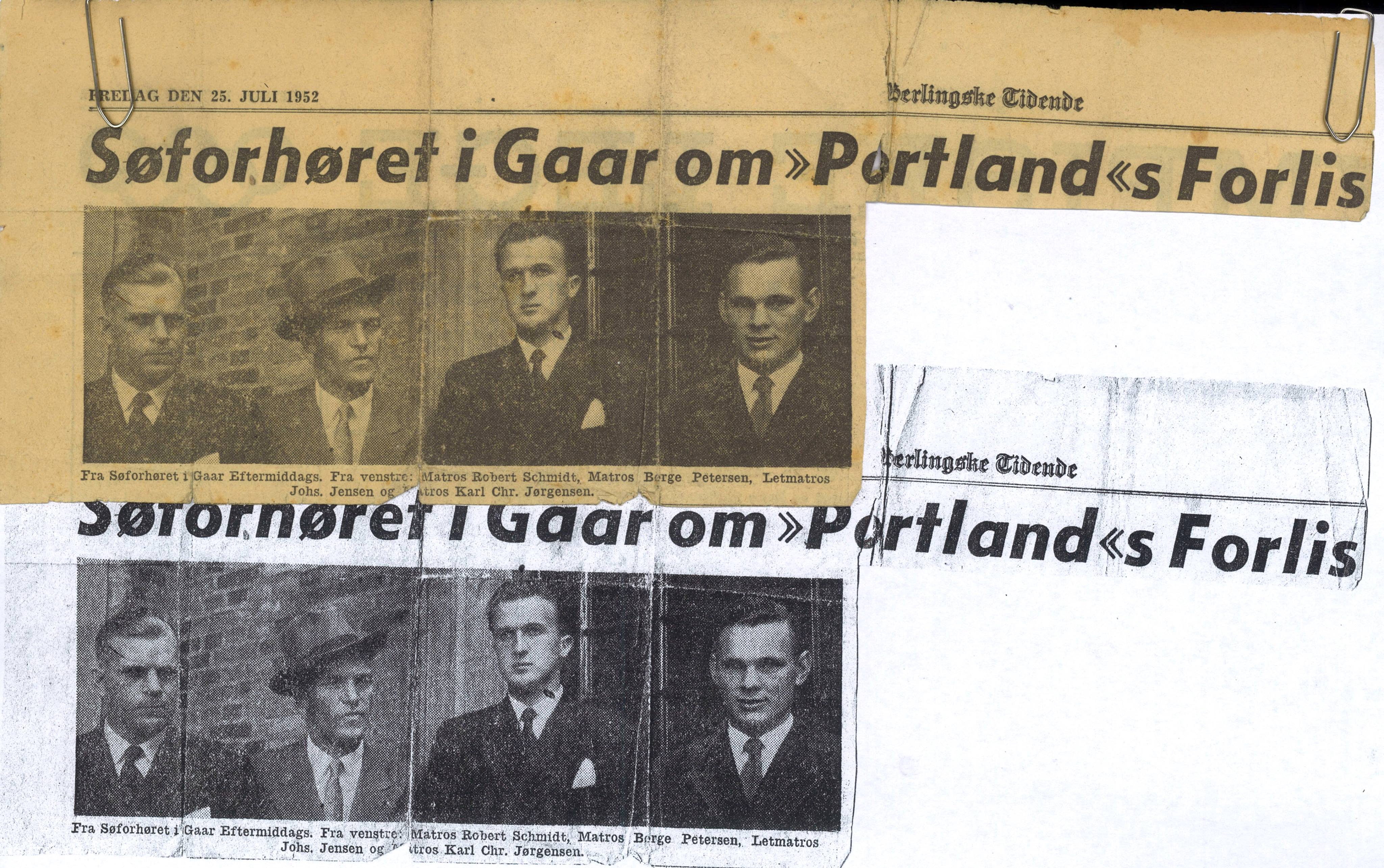Pludselig sank Portland hurtigere, og jeg blev bange for, at den med et sidste sug skulle tage os med sig i dybet. Jeg råbte til de andre: ”Spring i havet, før Portland suger jer ned!”